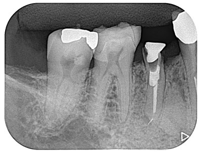 他院で抜歯宣告された歯です。下の奥から3番目の第2小臼歯です。この歯には4つの問題点があります。