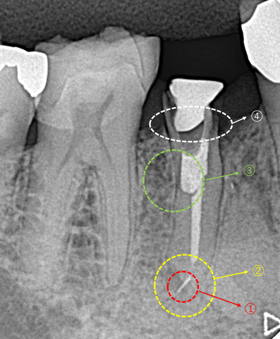 その理由は根の先の炎症がないから。という理由です。この症例では、根の先に炎症があります。この症例では破折器具が邪魔をしていて、根の先まで必要な薬が届きません。それに、”針”みたいな器具が折れているのを”そのまま”にしておいて大丈夫というのは、果たして誰の立場になっていうことでしょうか?