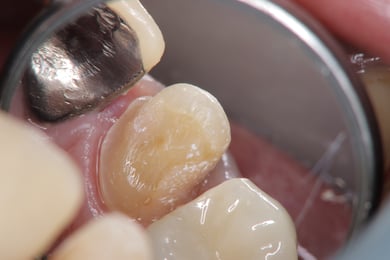 マスキングテープを使って、隣の歯や歯肉溝にセメントが流れ落ちないようにします。
