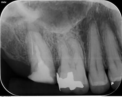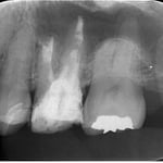 根管内には、3本の破折ファイルの残存。それ以外は、多量の軟化象牙質(一部は髄床底穿孔)。根尖病巣の存在。対合歯とのクリアランス少なく、保存するにも補綴するには無理か?と思われましたが、約1年。月に1度。当院から片道2時間半、かけて通っていただき、無事に補綴に至りました。