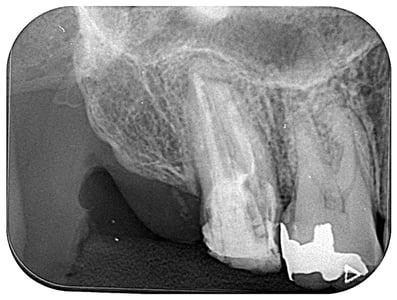 神経を除去した後でも,その後の処置がしっかりしていないと,管の中に細菌が繁殖し,骨の中に炎症を起こした結果,このように膿が溜り,激痛が生じます。