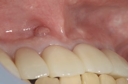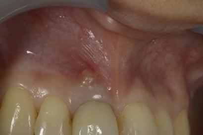 前歯の歯肉に近い場所に”おでき”のようなものができています。これを瘻孔(ろうこう、サイナス・トラクト)といいます。