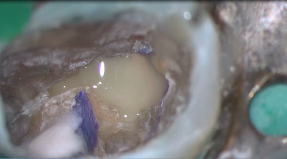 患者さんは何度説明しても虫歯の治療,虫歯の治療と思っていますが,これは根管治療です。上顎第一大臼歯の3本の主たる根管(神経や血管の入っていた管)を神経を取った後に感染を起こし,再治療の際,3本中の2本の管から大量の膿が排出してきた瞬間です。
