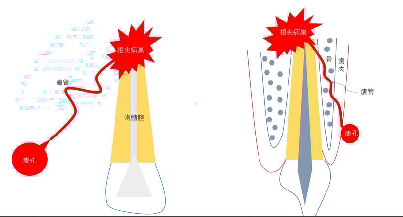 歯の神経を除去する治療をしていない歯であっても、何らかの原因で歯髄が死んでしまい、同様に瘻孔形成をすることもあります。