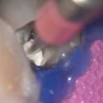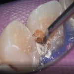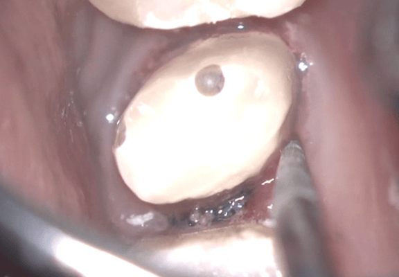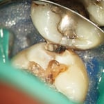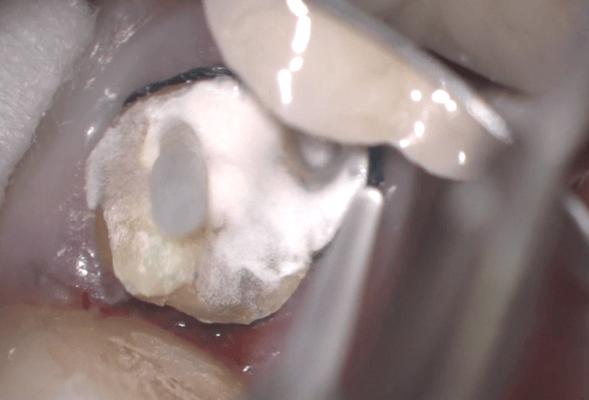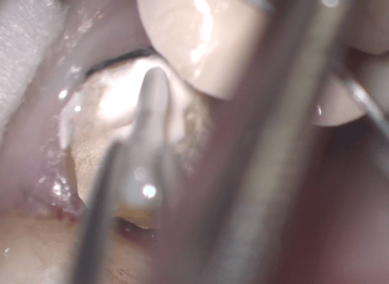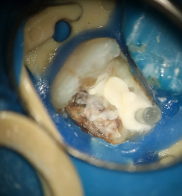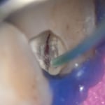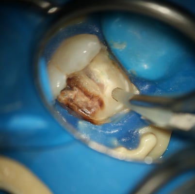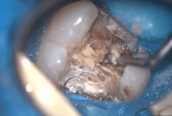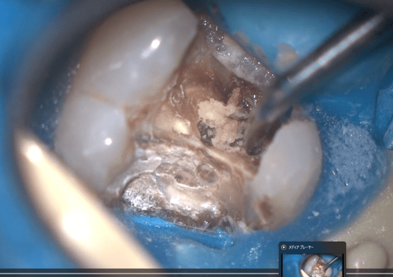 他院では抜歯と診断された歯ですが、それも間違えではありません。しかし、歯肉圧排をしたりすれば、保存できる可能性があることも多くあります。最初の状態ではラバーダム施すことが困難です。虫歯を除去中に歯髄の一部が露出しましたが、隔壁を作製し、防湿ができる環境を作って、歯髄を除去せずに保存できました。