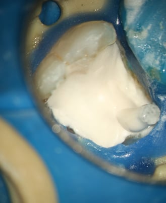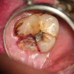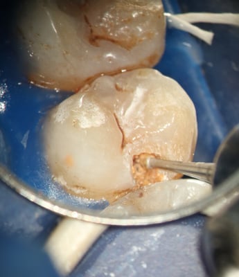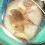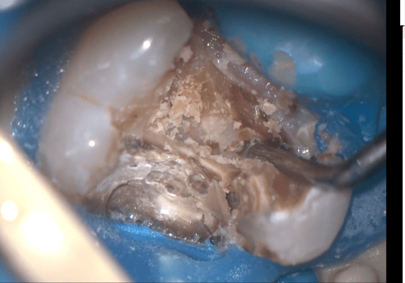 クラウンを外すと、歯肉縁下までの大きな虫歯が確認できます。ラバーダムができないので、簡易防湿を行い、歯肉溝からの浸出液の侵入を防ぎます。隣の歯の間にまたがる虫歯ですが、丁寧に軟化象牙質を除去します。歯髄の露出はありましたが、特殊なセメントで緊密にシール(絆創膏みたいなもの)します。歯髄を除去せずにすみました。