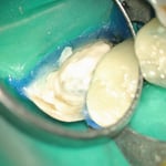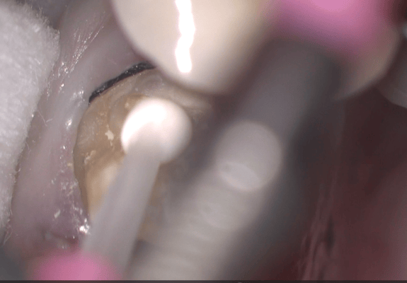 写真はすべてミラー像です。上顎左側側切歯遠心面の大きな虫歯です。エキスカで丁寧に軟化象牙質を除去していくと、歯髄腔まで本当に皮一枚になりました。血流が見えるようです。エキスカから伝わる組織の硬軟の感覚と対物-接眼レンズからの像が ”皮一枚”を達成できたと思います。皮一枚ですが、硬組織は残っていますので、ティース・プライマーを塗布し、スーパーボンド・ラジオオペークとバルクベースにて覆髄をしました。もちろん、1ケ月後の歯髄診でも陽性反応を示し、歯髄は生きています。