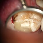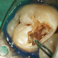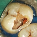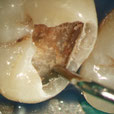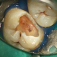 明らかに大きな虫歯で、虫歯(軟化象牙質)を丁寧に除去しているうちに、歯髄(神経と血管)が露出しましたが、その後、適切なセメントやシーリング剤を用いて、歯髄を除去せずに(根管治療をせずに)保存することができました。