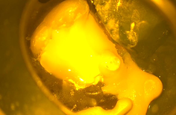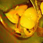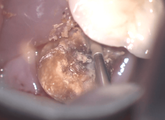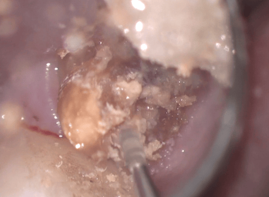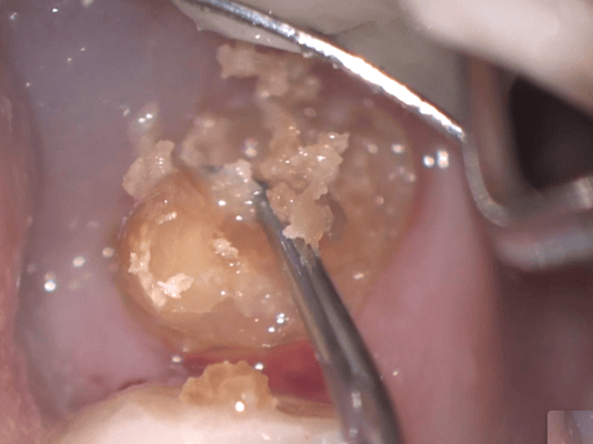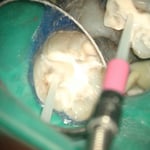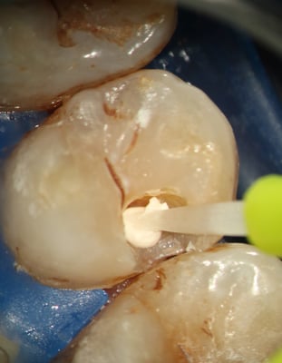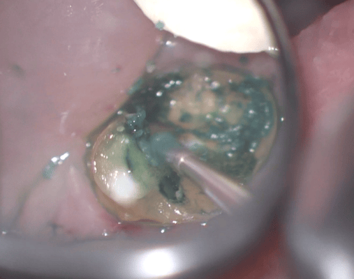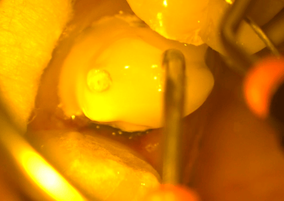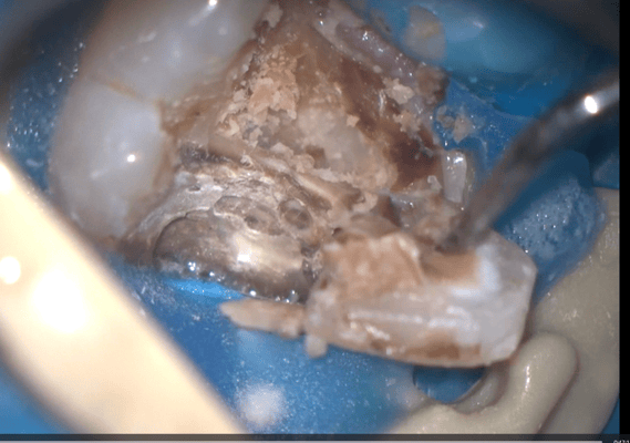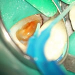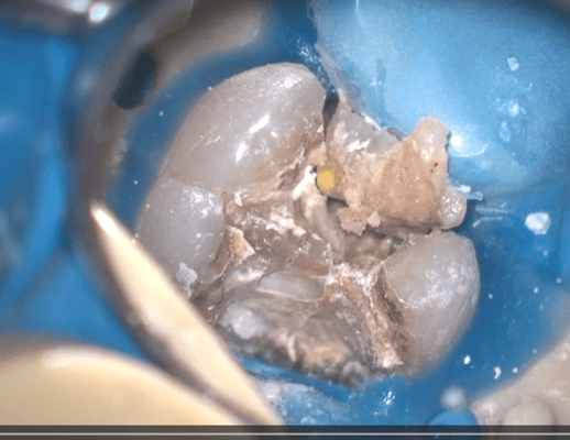 このように大きな虫歯でも、丁寧に虫歯(軟化象牙質)を除去していくと、第三象牙質の形成を伴って狭少になった歯髄腔の中の歯髄がまだ生きていることがわかります。術前の歯髄診断でも生活反応はありましたが、このような実際の状態をみると、歯髄診断の仕方も難しいなと思います。