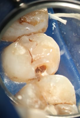歯と歯の間の虫歯(隣接面齲蝕)。これは、歯の”ヒビ”の隙間から生じた虫歯です。