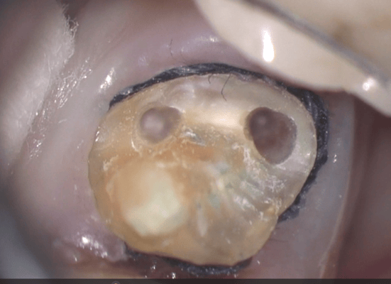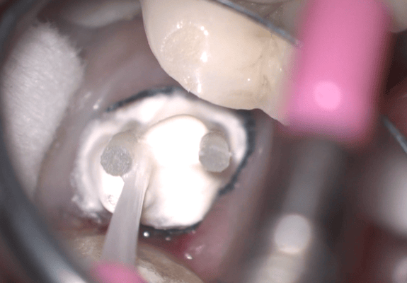 メタルインレー下にはレジンの覆髄が施されていましたが、接着しておらず、ポロリと取れました。これが、2次齲蝕(治療後の虫歯の再発)の原因です。多量の軟化象牙質(虫歯)を除去していくと、歯髄腔(神経と血管が入っている部屋)まで紙一枚。うっすら赤い血流も確認できます。齲蝕除去中に口蓋側の咬頭が破折しましたので、グラスファイバーポストによって、生活歯の支台築造。神経も取らずに残せる歯は、本当に多くあります。